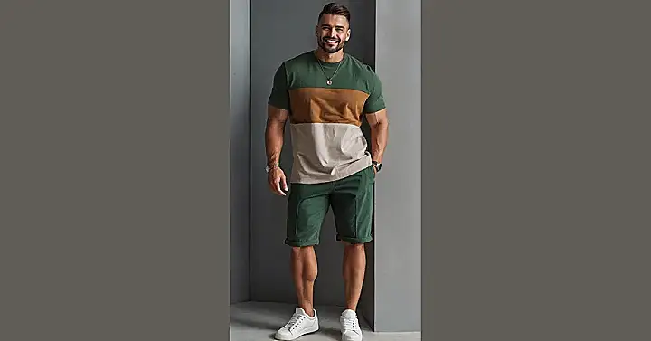 This guy’s rocking an outfit that screams, “I woke up like this, and yes, I look this good!” His color-block tee, with its chill blend of green, brown, and cream, looks like it was designed by a fashion wizard who loves both nature and snack bars. And let’s talk about the watches – he’s got one on each wrist! Maybe he’s tracking two different time zones, or perhaps he just believes if one watch makes you stylish, two watches make you a legend. Either way, he’s making a bold statement without even trying too hard.
