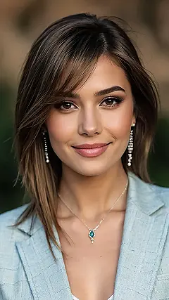 Getting a haircut can feel like a total gamble, right? You see all these influencers with these perfect ‘dos, and then you end up looking like you stuck your finger in a light socket. But fear not! The haircut in this picture is like the sweet spot – it’s modern with those cool layers but also totally classic because, well, it looks good on pretty much everyone. Plus, the bangs are *chef’s kiss*! Just be prepared to spend a few minutes each morning styling them so they don’t look like a bird decided to nest on your forehead!