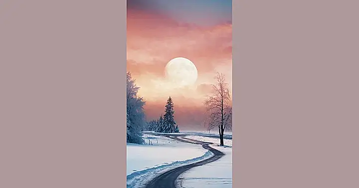 This picture is like a scene from a winter wonderland movie. The snow-covered trees and the winding road make you feel like you’re about to discover something magical. It’s like that moment in a movie when everything is quiet and peaceful, and you know something exciting is about to happen. And that giant, glowing moon hanging in the sky? It’s like a giant disco ball, ready to light up the night.
