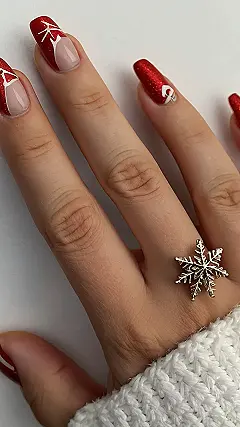 These nails are seriously festive! Look at those gorgeous red and gold designs – they’re like a tiny Christmas party on your fingertips. It’s the perfect blend of holiday cheer and chic style, way better than accidentally wearing mismatched socks on Christmas morning. And that snowflake ring? Total winter wonderland vibes! I bet even Santa would approve of this nail art – maybe he’d even ask for a manicure himself!