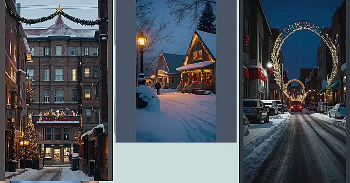 Picture this: a cozy Canadian street, all decked out for Christmas! Snow gently dusts the charming brick buildings, twinkling lights adorn every corner, and a giant star shines brightly above a festive shop. It’s like stepping into a real-life Christmas card, but way better because you can actually smell the hot chocolate and maybe even hear some carols drifting from a nearby window. Even the grumpy-looking snowmen on the rooftops seem to be smiling!