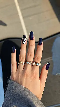 These dark blue nails are totally festive, like a midnight sky sparkling with winter magic! One nail even has some fancy shimmery detailing—perfect for adding a touch of glam to your holiday outfits. Imagine rocking these beauties at your school’s winter dance or while opening presents on Christmas morning! They’re so chic, you might even convince your friends to ditch the red and green for something more sophisticated this year.
