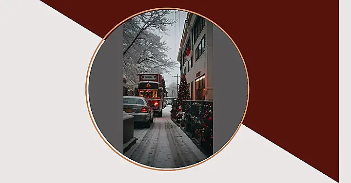 But wait, there’s more! Check out that charming street lined with beautifully decorated homes, each one trying to outdo the next with its festive cheer! It looks cozy and warm despite the winter chill, making you want to grab a hot chocolate and curl up by the fireplace. The whole scene just screams “Christmas in Canada,” full of festive magic and winter wonderland vibes. It’s enough to make even the grumpiest Grinch crack a smile – especially if that trolley bus is heading straight to a giant Christmas party!