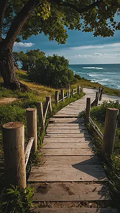 This picture makes me think of taking a slow, relaxing walk on a sunny day. It looks like the perfect place to get away from the hustle and bustle of life and just breathe in the fresh air. You can almost hear the sound of the waves crashing on the shore and feel the soft sand beneath your feet. Imagine strolling down that wooden pathway, surrounded by lush greenery and with the calming ocean view in the distance. It’s a picture that truly captures the essence of relaxing nature!