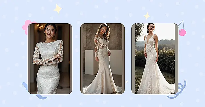 This wedding dress is seriously rocking that “fit” part, looking like it was custom-made for a red carpet and not just an aisle! See how it hugs everything just right, showing off those amazing curves? It’s got super intricate lace everywhere, from the long sleeves that look like delicate art to the sheer top that gives it a little extra sparkle. You just know wearing this makes you feel like a movie star who’s about to drop a mic, or maybe just perfectly pose for a million photos without even trying.