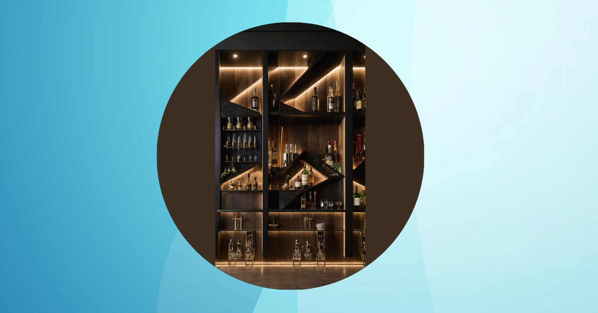 This house bar design isn’t just some boring set of shelves; it looks like something out of a superhero’s secret lair! The shelves are all angled and zig-zaggy, making the bottles look like they’re on a wild adventure instead of just sitting there. Plus, those cool lights shining up from below make everything glow like it’s a treasure chest of sparkling drinks. It’s definitely a conversation starter, like, “Whoa, did your wall just become a cool art installation?”