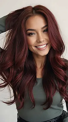 This hair color is like a sunset in a bottle! It’s got that deep, rich red that makes you think of juicy cherries, but with a hint of brown that gives it a touch of sophistication, like a fancy cherry cola. Imagine walking into a room and everyone just stopping to look at your hair – that’s what this color does! It’s totally eye-catching, but it’s still soft and flattering. Plus, if you’re feeling daring, you can even add some lighter streaks to make it pop even more.