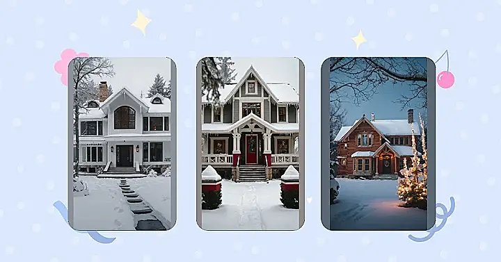 This house looks like something straight out of a holiday movie! Imagine cozying up inside with hot cocoa while watching the snow fall softly outside. The warm glow from the lanterns lining the steps leading up to the front door makes the whole scene feel magical, like a fairytale come to life. It’s the perfect winter house exterior, all decked out for the holidays— even the snow looks festive!