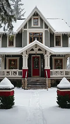 This house is seriously rocking the winter look! Imagine snuggling up inside with hot cocoa, watching the snow fall, while this gorgeous grey house, all decked out in white, keeps you warm and cozy. That bright red door is like a giant candy cane, popping out against the snowy backdrop and making you want to run right in and explore. Those icicles hanging off the roof look like sparkly, frosty decorations Mother Nature herself hung up.