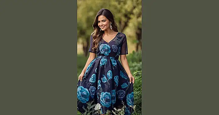 Hey there, fashion fans! Check out this stunning dress – it’s like a garden party exploded onto fabric! The “elegant floral dress” keyword totally fits because it’s got these gorgeous, big blooms all over a beautiful blue background. Imagine twirling in this thing – you’d be the prettiest flower in the whole garden (even prettier than the real ones!). Seriously, those fluttery little sleeves are super cute, and it’s got pockets! Who doesn’t love pockets in a dress?