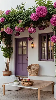 And who can ignore that fantastic purple door? It’s not just a door; it’s a statement piece, probably whispering, “My favorite color is *fabulous*.” Paired with those joyful pink blooms, this home’s flower decor isn’t just pretty; it’s practically a giant welcome mat for your soul. With that cozy table ready for snacks and that comfy-looking seating, this isn’t just a doorway; it’s an invitation to kick back, relax, and soak up some seriously good vibes. It proves that a little imagination and a whole lot of flowers can turn any home into a show-stopping, smile-inducing masterpiece.