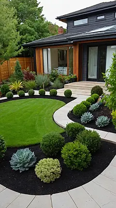 Those sleek black pots really make the plants pop, don’t they? It’s almost like they’re little plant superheroes, ready to fight off any garden boredom with their super-stylish looks! Plus, the pathway looks like it’s made of giant, delicious cookies (don’t try to eat them though!). It’s the perfect place to take a stroll, admire your amazing handiwork, and maybe even convince your friends that you have your own secret botanical garden, straight out of a fantasy movie.