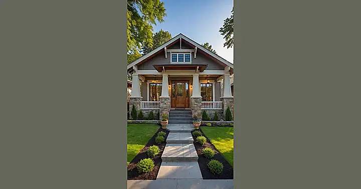 Picture yourself strolling up this awesome stone path – no tripping allowed, because this path is solid! This house isn’t just a pretty face; it’s a prime example of a Craftsman style, which basically means it’s built to last and look super cool doing it. See those chunky wooden beams under the roof and around the windows? That’s not just for show, though it looks amazing, it screams ‘I’m a sturdy home, ready for pizza nights and epic movie marathons,’ surrounded by all those chill trees that probably know all your secrets.