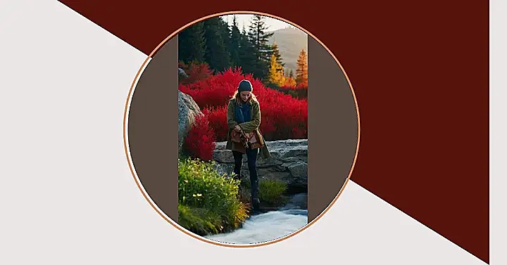 This picture is like a scene straight out of a fairytale! A girl, dressed in her warmest clothes and cutest beanie, is standing by a stream in a forest. You can tell the leaves are turning colors because the trees in the background are all shades of red and orange. It’s like the forest is putting on a big, beautiful show for her! And she looks so happy, maybe she’s thinking about all the hot cocoa she’ll drink when she gets home.