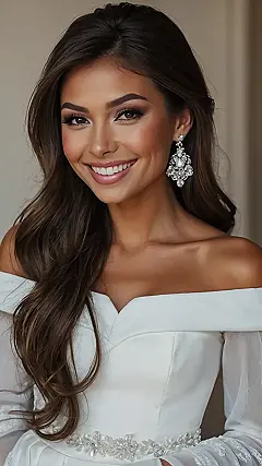 This bride’s hair is giving us major fairytale vibes! Look at those gorgeous, long waves cascading down her shoulders—half up, half down, just like the picture perfect bridal style you’ve been dreaming of. It’s like she stepped right out of a romantic novel, and those sparkly earrings? They’re the cherry on top of this seriously amazing wedding look. You know what else is awesome? This hairstyle is super versatile; you can totally rock it for prom, a fancy party, or even just a fun night out with friends. It’s all about feeling confident and beautiful.