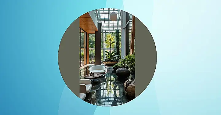The plants are so lush and green, it’s like they’re whispering secrets about hidden waterfalls and exotic birds. And the smooth, shiny floor? It reflects all that natural light and makes the whole place feel super fancy. You can almost imagine sipping a glass of lemonade in this little piece of paradise!