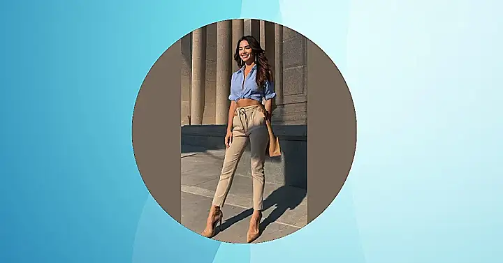 This lady’s outfit is giving major “I’m here to slay” vibes. The light blue shirt tied up at the waist makes her look cool and confident, while the beige pants are comfy and stylish. And those heels? Let’s just say she’s ready to conquer the world, one step at a time!