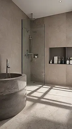 Step aside, regular bathrooms, because this one just rolled out the red carpet for luxury! That giant, round bathtub looks less like a place to just wash and more like a personal concrete oasis, practically begging for some bubbly and a rubber ducky fleet. This isn’t your average “get clean and get out” kind of space; it’s designed for total chilling out. With those sleek grey tones and smooth walls, it practically screams, “Welcome to your own private spa, no parents allowed!” You might even be tempted to do your homework in here, it’s that cool and calm.