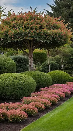 Whoa, talk about a garden that’s got its act together! This isn’t just a collection of plants; it’s like a perfectly choreographed botanical ballet. Those super round green bushes in the middle look like they just came from the most exclusive plant barber, probably discussing their latest trim. And right upfront, a whole parade of vibrant pink flowers is marching in neat rows, looking absolutely thrilled to be the main event in this gorgeous flower garden. They’re practically posing for a selfie!