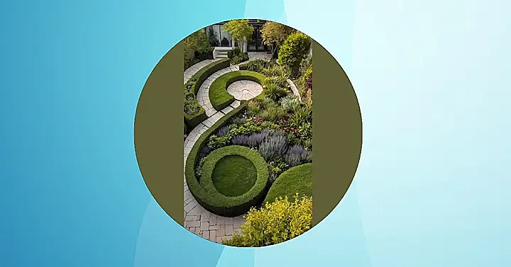 Picture this: those wavy green hedges could totally be rosemary or thyme, ready for your next culinary experiment, adding a fresh scent and flavor. And those vibrant purple flowers? Hello, lavender for some fancy lemonade or even homemade ice cream! We could turn that circular patch into a mini pizza garden with tomatoes, basil, and oregano, all perfectly contained within its stylish edges. It’s like having your cake (or, well, your organic kale) and eating it too, all while still impressing the neighbors with your super chic, snackable landscape. Who needs boring old bushes when you can have a garden that’s both a feast for the eyes and a buffet for your belly?