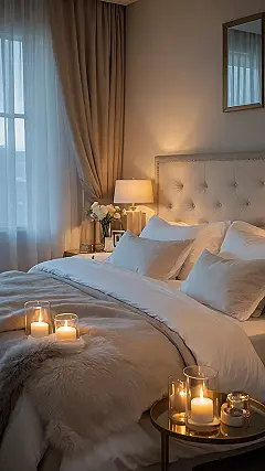 Check out this bedroom! It’s basically a giant, comfy hug wrapped in a room. You’ve got that super soft bed looking like a cloud, piled high with enough pillows to build a fort, and a throw blanket just begging you to snuggle up. The lighting from those cool lamps and the glowing candles on the floor makes everything feel extra peaceful and fancy, like you’ve walked into a chill-out zone designed by a relaxation expert. This spot is definitely serving up major cozy vibes, making it the perfect setting for a quiet evening… or, you know, for pretending you’re in a romantic comedy that’s just a few rose petals short of a grand gesture!