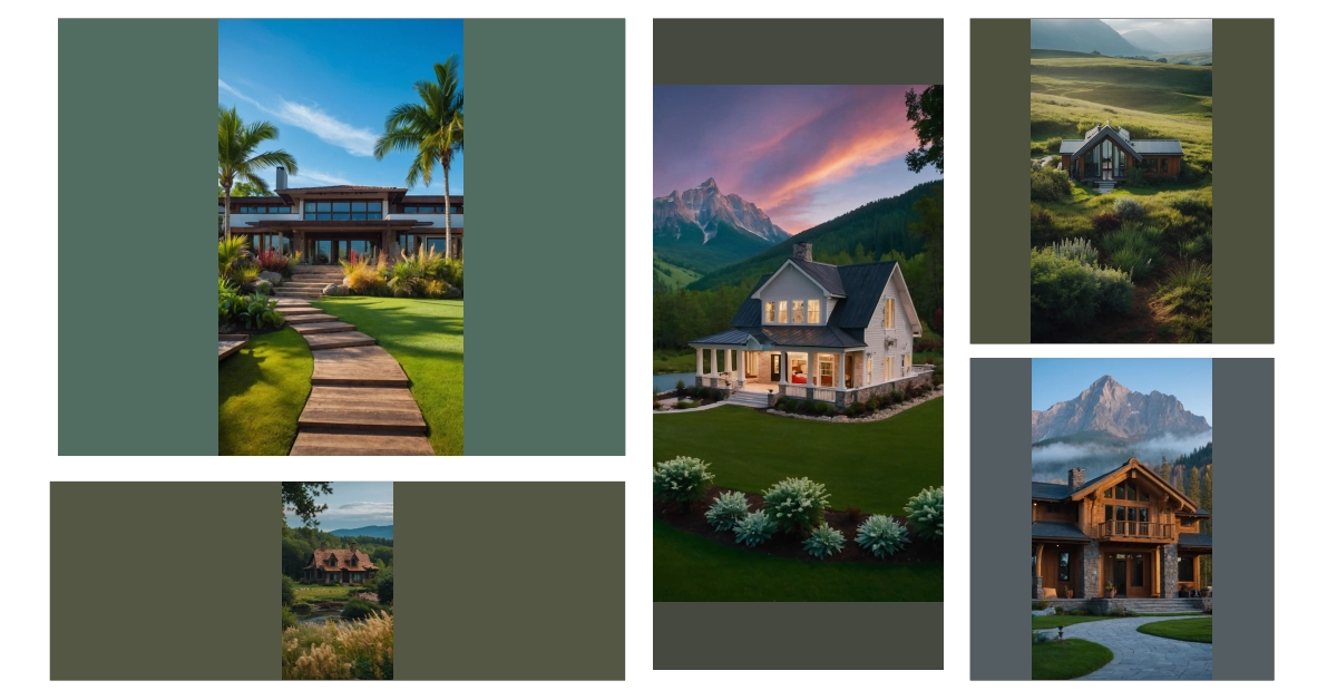This house is like something out of a fairytale! It sits nestled among rolling green hills, with majestic mountains rising up in the background. The warm glow of the sunset paints the sky with beautiful pink and orange hues, making it look like a scene straight from a storybook. Imagine sipping hot cocoa on the porch as the sun sets, watching the stars twinkle above. This home definitely has the “dream nature home” vibes!