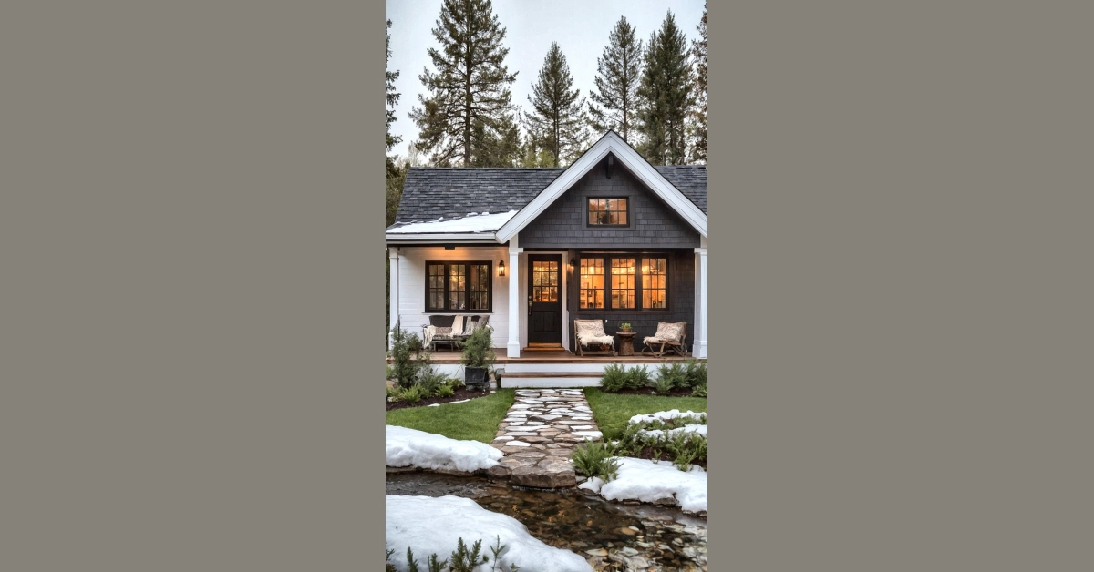This picture shows a super charming house that practically screams ‘cozy.’ With its crisp white walls, cool black trim, and a porch just begging for a lemonade break, it looks like the perfect spot to kick back. This place totally nails the whole ‘tiny house’ vibe – sleek, stylish, and probably small enough that you can shout from the kitchen and still be heard in the bathroom. Just don’t plan on hosting a surprise party for your entire grade here, unless everyone is really good at playing musical chairs with minimal actual chairs.