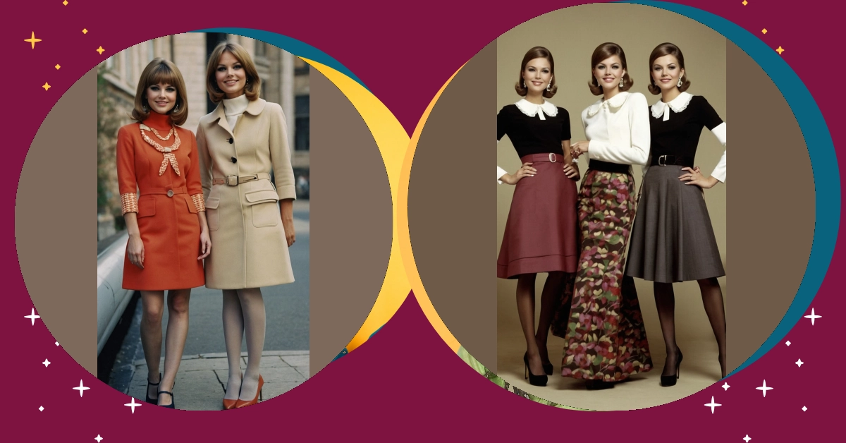 These ladies are rocking the sixties fashion scene! With their bold colours, geometric shapes, and super-cute mini-skirts, they’re totally ready to hit the town. The white boots on the left are a little odd, but hey, that’s just the groovy sixties for ya! You gotta love the confidence these ladies are showing off, like they own the whole world.