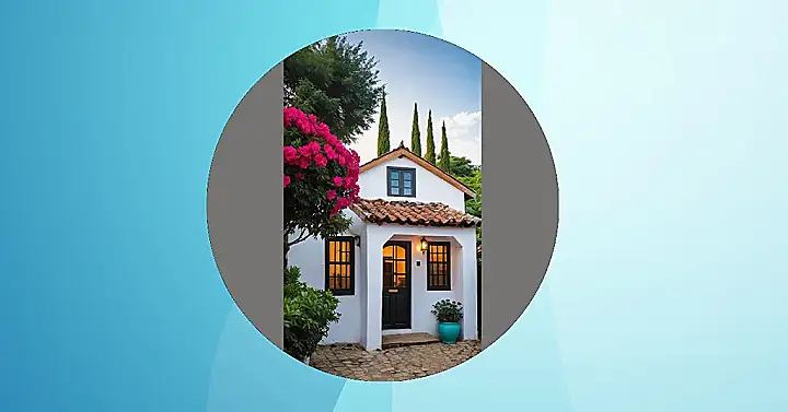 Just look at this charming little house! It’s so perfectly tiny, you could probably scoop it up and put it in your pocket. With its crisp white walls and a roof that looks like it’s made of sun-baked terracotta, it practically screams ‘cozy vibes only.’ And who could miss those giant, ridiculously pink flowers trying to steal the spotlight on the left? They’re so vibrant, they probably send postcards to other houses saying, ‘Wish you were this colorful!’ This small village gem definitely knows how to make an entrance.