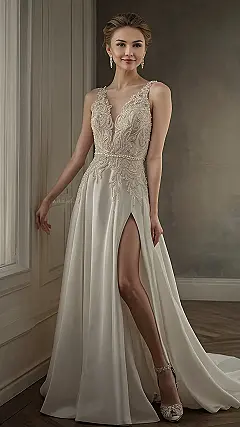 This “pearl wedding dress” is seriously dreamy! The way the lace and pearls are arranged is so intricate; it’s like someone carefully embroidered a whole garden of tiny flowers onto the fabric. And that slit? It’s giving major “modern princess meets red carpet glamour” vibes. Imagine walking down the aisle in this – you’d practically hear angels singing (and maybe also your friends whispering, “OMG, that dress!”).