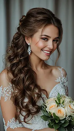 This stunning half-up, half-down hairstyle is basically the superstar of winter wedding looks. Just look at those beautiful, bouncy curls cascading down! It’s the perfect blend of practical and glamorous: the top half is neatly pulled back, so you won’t have any rogue strands flying into your face during the vows or getting caught in your cousin’s hug. Plus, all that gorgeous volume provides a secret layer of warmth around your shoulders, making you look effortlessly chic even when it’s frosty outside. It’s like your hair is saying, “I’m fancy, but also, I’m prepared for a snowball fight… just kidding, I’m a bride!”