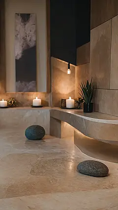 This spot looks like the ultimate ‘healing room’ for when your brain feels like scrambled eggs after a long day. Forget dramatic movie scenes; this place is for recovering from the truly epic battles, like trying to remember what you studied for that pop quiz or surviving a group project. With the chill lighting, calm candles, and those perfectly smooth stones that probably hold secrets to eternal peace, you can almost feel the stress just… rolling off you like water off a duck’s back. It’s basically a fancy way of saying “Nap Allowed Zone.”