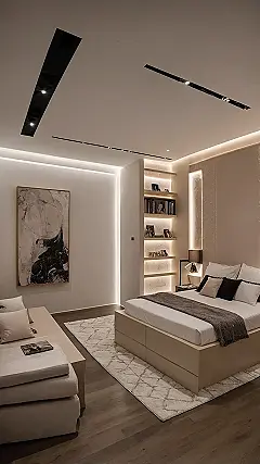 Walking into this room feels like stepping into a peaceful, super-stylish dreamland, right? It’s got that soft, glowy lighting that makes everything look amazing – perfect for those late-night study sessions (or, let’s be real, TikTok scrolls). Forget boring overhead lights; those cool LED strips around the walls and shelves are practically begging for you to host a chill hangout. It’s so sleek and tidy, you almost wonder if a tiny, invisible robot cleans it every hour. This is the kind of ‘teen girl room decor’ that whispers “I’m sophisticated” while secretly having enough comfort for a mega movie marathon.