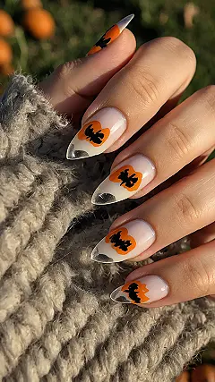 Check out these absolutely adorable Halloween nails! With their fierce yet friendly pointy shape and those cute little orange pumpkins sporting classic jack-o’-lantern grins, you’ll be ready to haunt any pumpkin patch or festive gathering. The cozy sweater in the background just adds to the whole autumn aesthetic, making these nails the perfect accessory for sipping hot cider and pretending you’re not totally scared by every rustle in the leaves. Who knew spooky could look so chic and sweet at the same time?