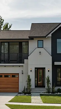 This house isn’t just a home; it’s a total vibe! Imagine walking up the neat little stone path, past perfectly-trimmed bushes that probably have their own Instagram accounts. The sleek, modern design with its mix of white and dark accents is like something out of a home decor magazine—but way cooler. It screams “effortless cool” while still being totally welcoming, like that friend’s house you always want to hang out at. That gorgeous wooden garage door? It’s practically begging you to park your awesome ride inside.
