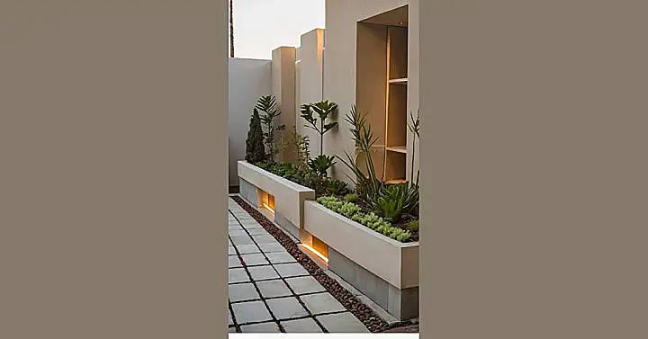 Look at those sneaky little lights tucked under the plant boxes! They’re giving off a “secret garden party” vibe. The whole design is super clean and modern, kind of like something you’d see in a fancy movie set. The plants are just chilling, not fighting for attention. It’s proof that less really can be more, even when it comes to getting your green thumb on.