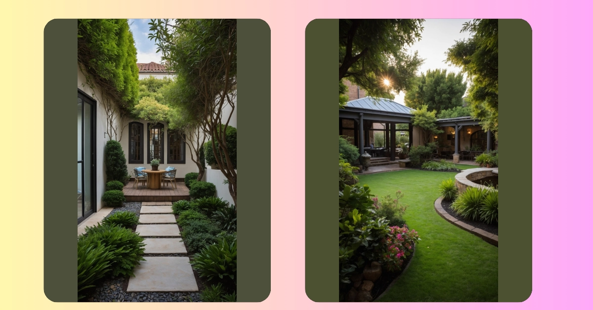 Check out this backyard situation! It’s basically a chill zone disguised as a fancy Italian-inspired courtyard. Look at those hedges – they’re so perfectly trimmed, they probably use a ruler. It’s like the garden is saying, “Yep, I’ve got my life together, even if you don’t!” The water feature is like a super calm mirror, reflecting the sky and making everything feel extra peaceful, perfect for pretending you’re on a luxury vacation instead of just steps from the house.