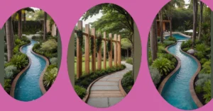 And don’t even get us started on the rest of this outdoor wonderland! The path itself looks like a red carpet for your feet, with those neat flat stepping stones surrounded by a sea of pristine white pebbles. It’s so tidy, you might think it has its own tiny robot vacuum cleaner! Those chunky wooden planters holding cool, spiky plants add a modern touch, proving that ‘outdoor gardens design’ isn’t just about flowers; it’s about creating a super chill space where you can kick back on that comfy chair in the background, probably avoiding chores or planning your next brilliant scheme.