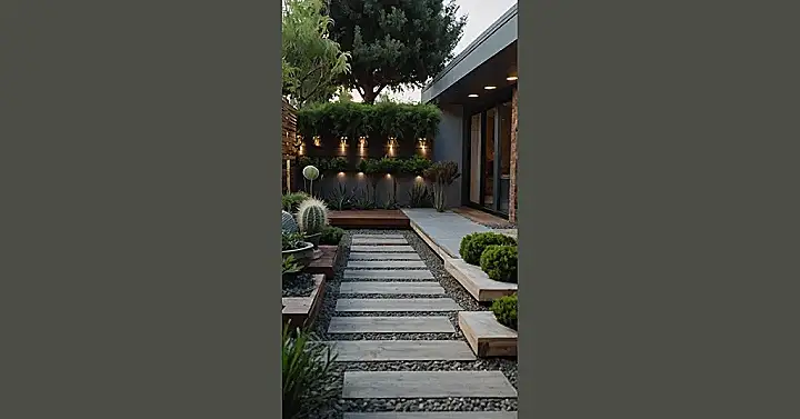 The stepping stones create a neat path perfect for strolling through your mini-jungle, and the black fence adds a modern, sleek touch. This design is a great example of how you can combine style and practicality to make a small garden feel incredibly spacious and luxurious. Who needs a huge lawn when you can have a beautiful, compact garden that’s super easy to maintain?