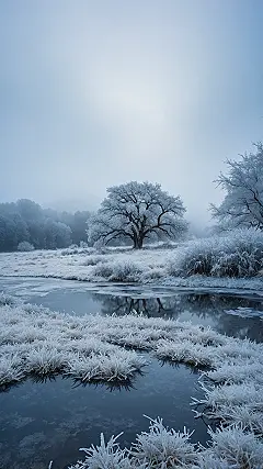 Brrr, just looking at this frosty wonderland makes me want to grab a giant blanket and a mug of hot cocoa! It’s like someone accidentally left the world’s biggest freezer door open overnight, and now everything is sparkling with a thick, fluffy coat of ice. Even the little stream winding through the landscape seems to be whispering, ‘It’s a bit nippy today, isn’t it?’ The trees are decked out in their finest winter bling, looking absolutely majestic, and the grass below is all fuzzy, like it’s trying to grow a winter beard. You can almost feel the crisp, cold air, but in a totally cool, awe-inspiring way.