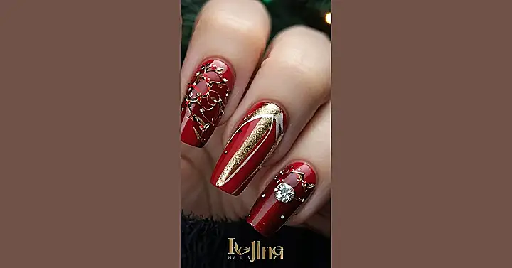 Seriously, these nails are so festive they practically sing carols! The rich, shimmery red is like the perfect Christmas candy, and those gold accents are like little snowflakes dancing across your fingertips. Just picture yourself reaching for a delicious cookie or opening a present with these – they’ll be the star of the show, stealing the spotlight from even the fanciest of wrapping paper. You’ll be ready for all the holiday fun and photo opportunities!