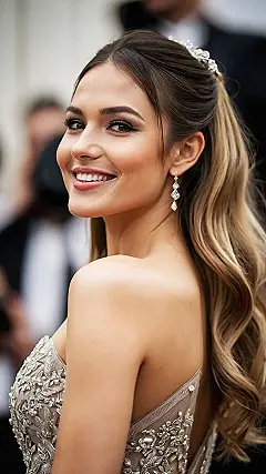 The girl in this picture is definitely ready for a gala! She’s rocking a seriously gorgeous hairstyle that looks like it took forever to get perfect, and it’s giving us major prom vibes. Those loose waves look like they could bounce right out of the picture, and that sparkly hairpiece is just the cherry on top! You can tell she’s feeling confident and ready to shine, like a total princess at a fancy ball!