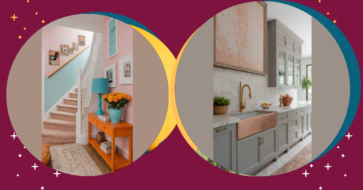 Stepping into this hallway is like getting a big, warm hug from a rainbow! Who decided hallways had to be boring? Not the person who designed this place! With walls rocking a cheerful pink and a sky-blue splash, plus a super cool orange table that practically shouts ‘hello!’, this spot is basically a high-five for your mood. It’s the ultimate dopamine decor, making sure you feel happy and bubbly before you even hit the second step on those cozy, fluffy stairs.