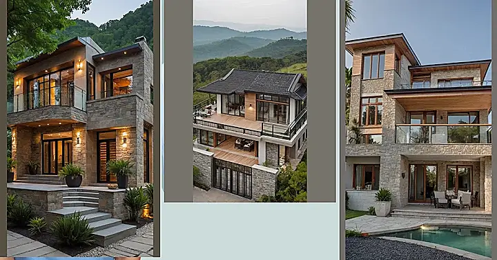 This isn’t just a house; it’s practically a level-up in architectural awesomeness! With its cool stone walls, massive windows, and balconies that seem to float, this place is definitely rocking a unique house design that’s anything but basic. It looks like it could host a secret super-spy meeting one minute and a chill movie night the next, all while probably making the neighbors wonder if a famous rock star or a tech billionaire just moved in. You can almost hear it whispering, “Yeah, I’m this cool, what about it?”