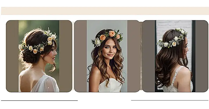 This picture shows a gorgeous wedding hairstyle – long, wavy brown hair perfectly framed by a delicate flower crown. It’s like the model stepped straight out of a fairytale! Imagine yourself walking down the aisle, looking like a princess, with this beautiful crown adding a touch of whimsy and elegance. It’s the perfect mix of romantic and cool; you’ll be the most flower-powered bride ever!