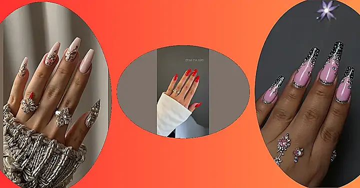 Seriously, these nails are goals! The intricate designs are so detailed and lovely, they’re practically tiny works of art. And those rings? They’re adding another layer of sparkle and sophistication. It’s the perfect combination of a fancy look and fun nail art. You’ll be the envy of everyone at school with these trendy, unique nails.