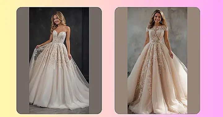 Forget everything you thought you knew about wedding dresses, because this one isn’t just a dress, it’s a whole vibe! With its stunning, soft goldish color, it practically glows, making everyone wonder if you secretly raided a leprechaun’s treasure chest. The way that lace just spills down in flowery patterns makes it look incredibly delicate and fancy, like something out of a fairy tale but way cooler. You’d probably need a team of tiny squirrels just to fluff that skirt before you walk down the aisle.