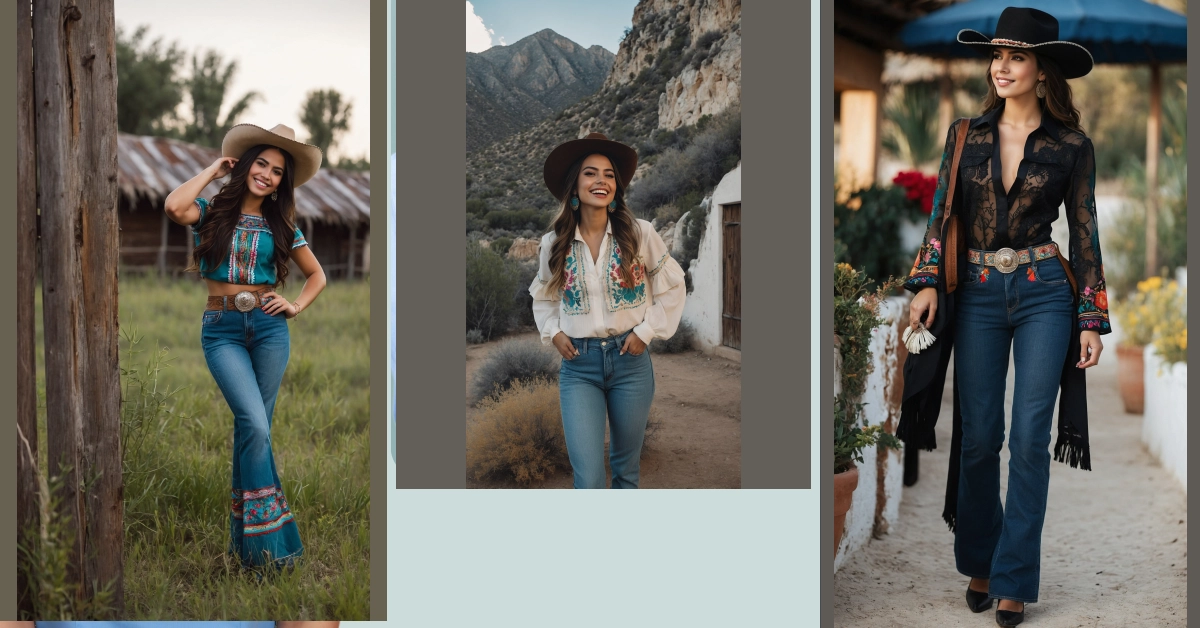 Look closer at that amazing embroidered neckline and the shiny, intricate belt buckle – seriously, you could probably see that sparkle from a mile away! It’s like a secret code of coolness, mixing traditional Mexican rancho vibes with modern flair that makes a statement. And those bell-bottom jeans? They’re having a major comeback, making this look not just totally authentic but also super trendy. You’ll be strutting around feeling like a mix of a cool cowgirl and a pop star, ready for anything from a fun festival to just hanging out with friends, looking effortlessly awesome.