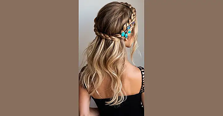 This hairstyle is seriously cool! It’s like a modern take on a classic hippie look. See that gorgeous braid wrapped around the top? It’s not your grandma’s braid – it’s super stylish and totally updated. The long, wavy hair flowing down is perfect for dancing the night away (or just chilling with friends). Plus, those sparkly little hair clips? They add a touch of magic, kind of like finding a four-leaf clover in your hair. It’s totally Instagram-worthy, and you could definitely rock this at a festival or a party – or even just a regular school day if you feel bold!