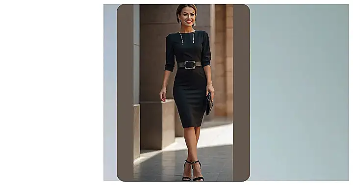 This lady is rocking the classic “little black dress” look! It’s a timeless choice that always makes you feel confident and put-together. The sleek, simple design is totally chic and the black belt with a fancy buckle adds a touch of personality. She’s got the whole “I’m ready for anything” vibe going on, and those heels? They’re just the perfect finishing touch.